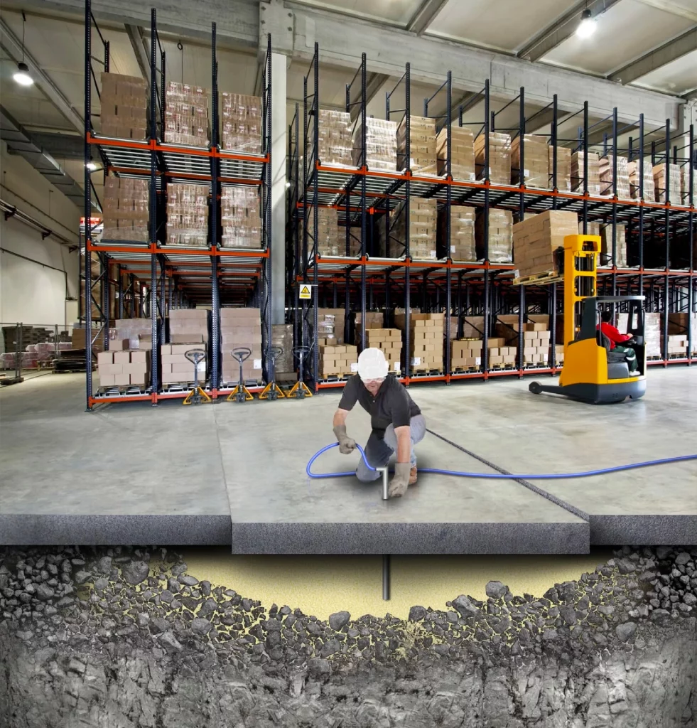 Les dallages de bâtiments industriels, garages ou entrepôts peuvent s’affaisser sous l’effet du poids des équipements ou de la circulation intense, créant des risques de chute et des difficultés d’exploitation.